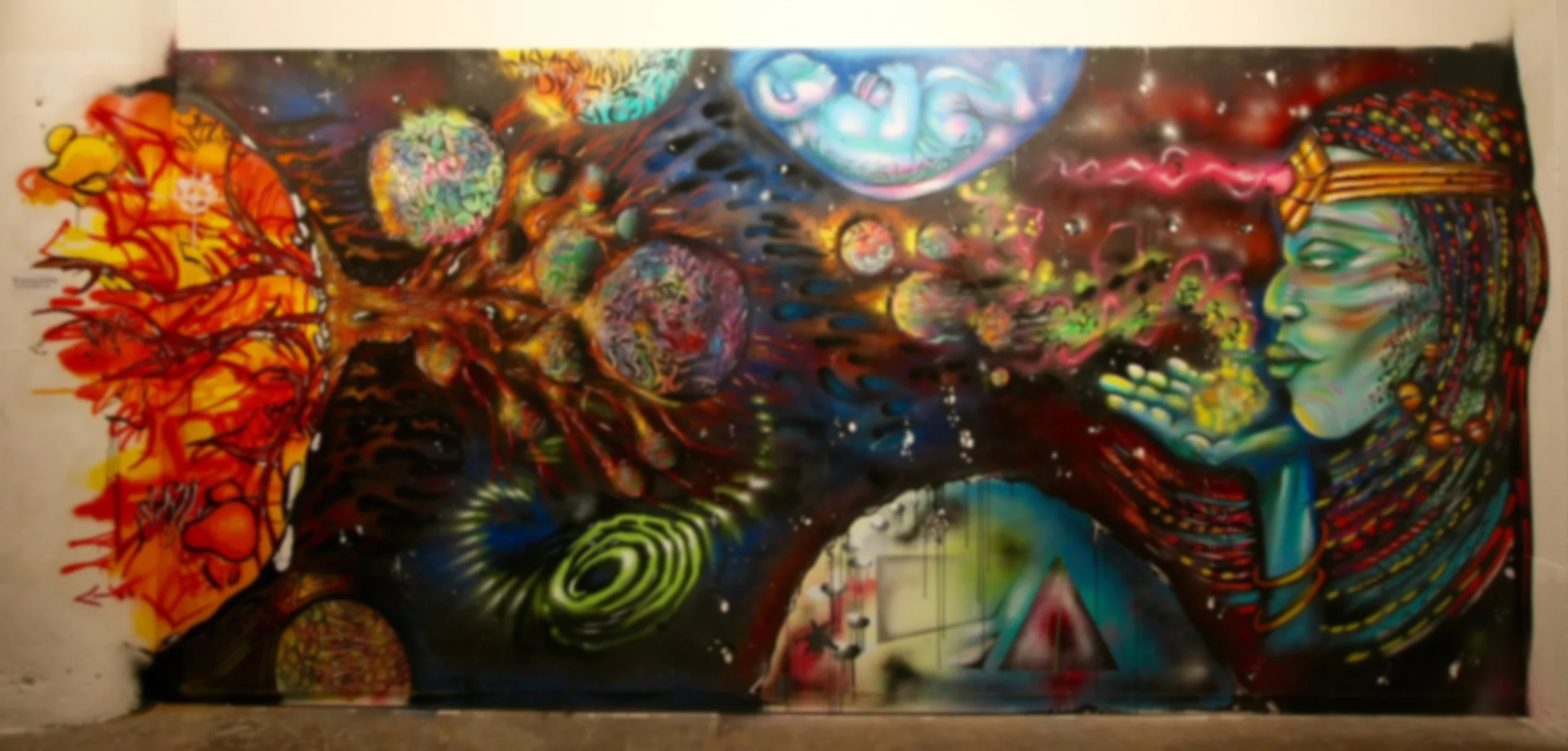 With “Death” as the closing chapter of “Infinite Life” and Brain Killer and Yoki being leaders of the monster and horror genre, they were naturally tasked with interpretation of the theme. There are a couple of technical aspects to this section of the mural that show great skill of these two. With 6 light sources highlighting the faces of the characters, they gave a lot of depth to the zombie apocalypse we are presented with. Secondly is the amazing mushroom cloud that anchors the entire mural. Purple and pink highlights beneath the clouds shading over the yellow hue of the cloud. One of the impressive details of the show is the mushroom. The gradual shading and great symmetry contributed to the amazing effect resulting in what most of the participating artists have found to be the coolest feature of the show.