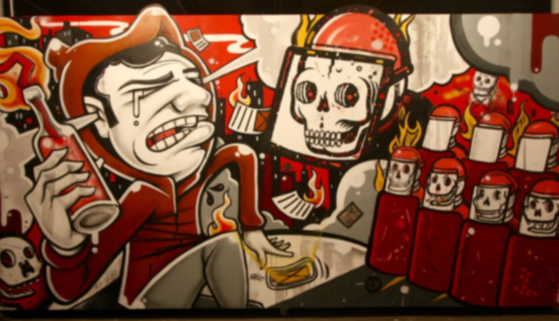 Childhood brings with it a sense that nothing can harm us as we rush at the world full tilt. In some cases this results in us fighting against the environments we’re born into. With this chapter artists Statik and Dred created a world in which a child super hero following his hero to battle against the demons that haunt his daily life. The panel for this piece was selected because of the incredible amount of detail it contains. Down to the last detail of the trash on the street it really sets the tone for the vengeful street scene laid out. A detail even more impressive is the faint color fans that appear to be emanating from the glove. These are supposed to represent the energy coming from the glove worn by the hero leading the charge for the dynamic duo. This was achieved through a great sense of spray control by Statik, in order to lightly apply the paint to achieve the result that he did. During this painting session many of the artists stood around and looked on impressed at the technique that Statik wa able to achieve. This is along with Yoki’s mushroom on the “Death” mural are two of the standout technical features.
