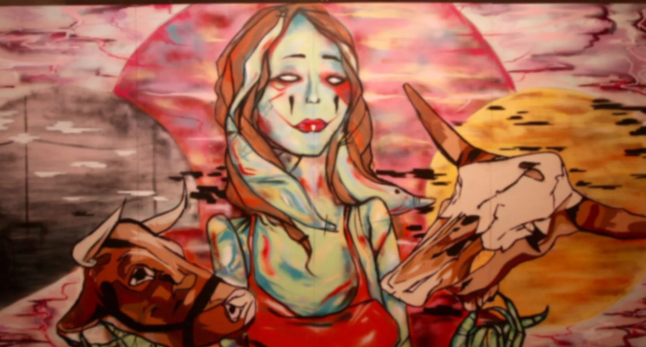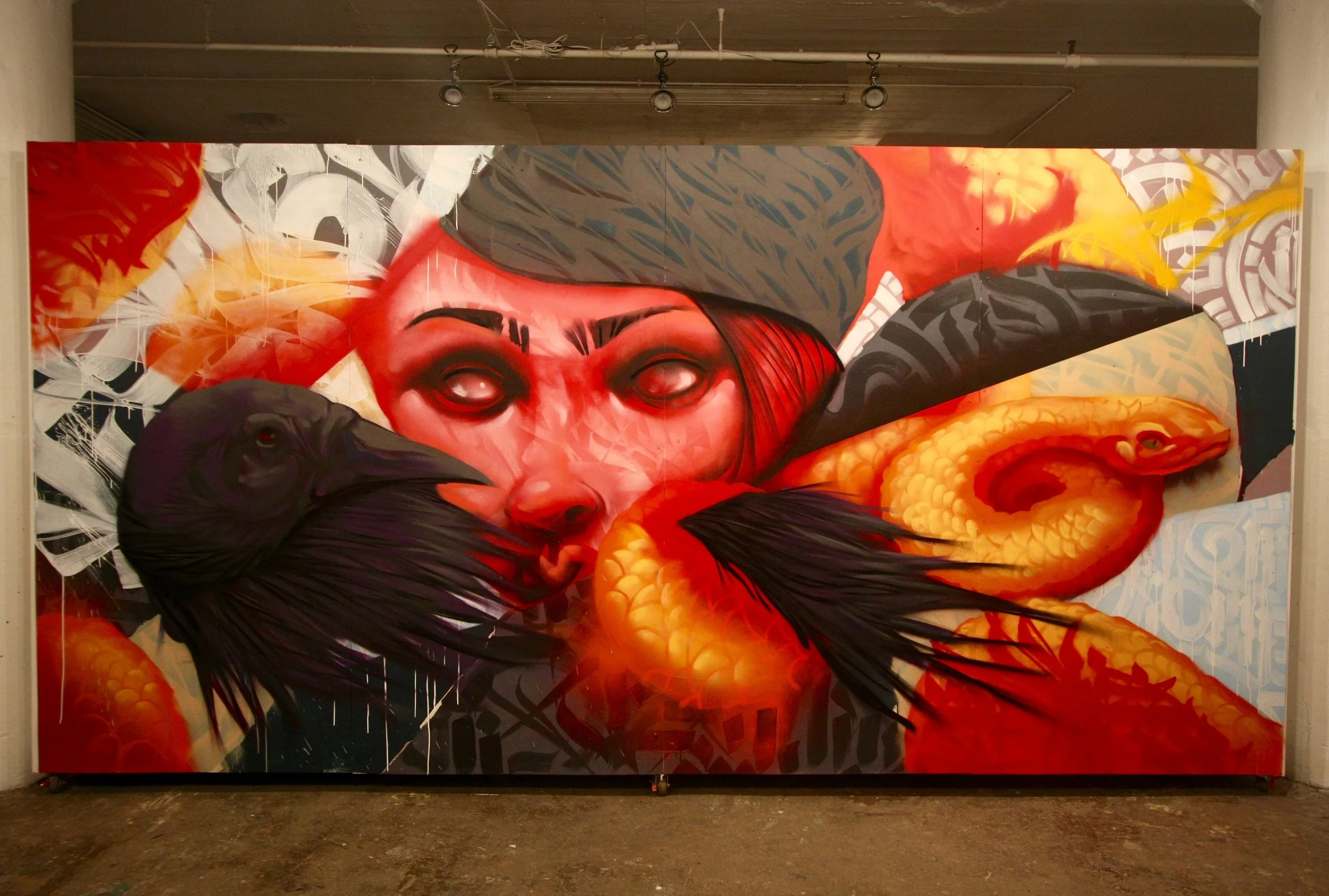 With two distinctively different styles, the chapter “Temperance” as interpreted by Bunny Xlv and Cera resulted in a unique mural that was another first collaborative effort. The free form style of Bunny Xlv lends itself to great character work and color blends which in this case are overlaid by the detailed cow heads and moons. Cera worked primarily in acrylic spray paint, with Bunny adding layers of detail with detailed brushwork. The characters lips and eyes are one of the defining characteristics of Bunny’s work and they come across exemplary here. This mural continues to reveal it's beauty over time and is a pleasure to view in its entirety.