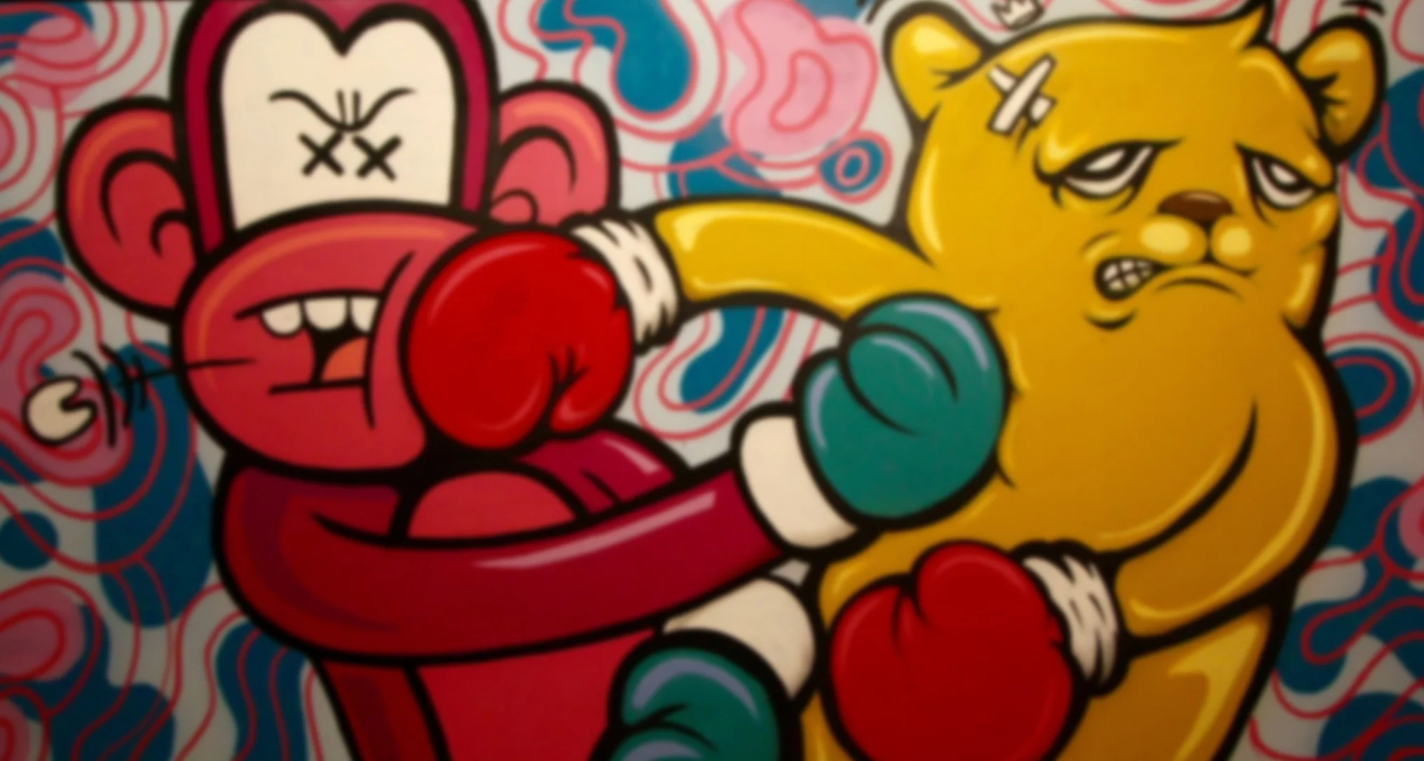 JC Rivera and Mosher are two of Chicago’s most recognizable character artists. For Failure they came together to create a pop cultural piece where the two characters express failure by simultaneously knocking each other out. This is the first time these two artists painted together to make a collaborative piece of this type. Clean, animated lines made it a natural fit and show their skill at the effortlessness of it. This piece was selected to show Mosher’s character style, if you notice the glove of JC’s bear in the right frame you can see how their styles work together.