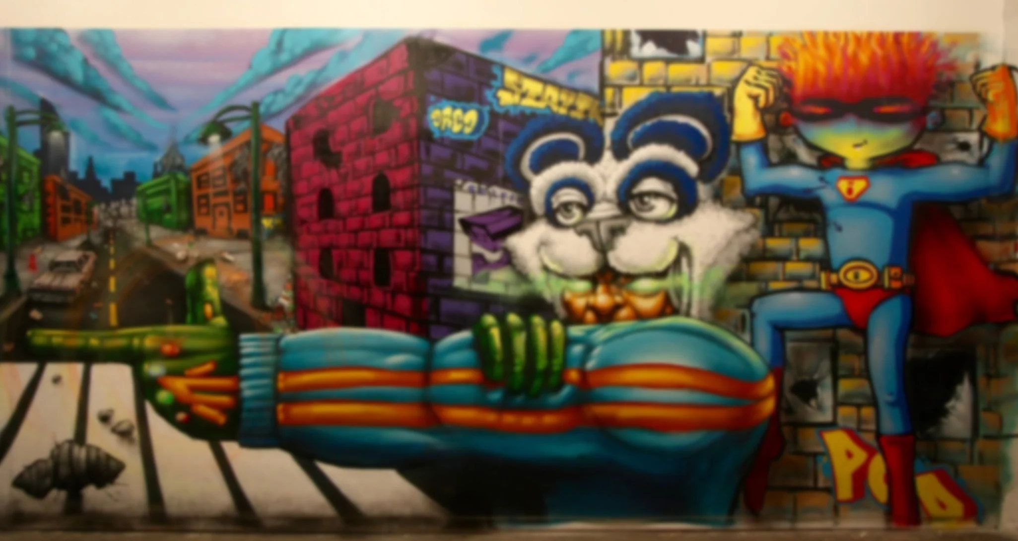 Cyfn, with his expertise in color splash’s and blends combined with Labrat’s incredible sense of old school hand styles and anime character resulted in a gorgeous layering affect that makes the colors pop. These two artists, because of their innate talent with colors created what I feel is one of the most color filled pieces of the set.