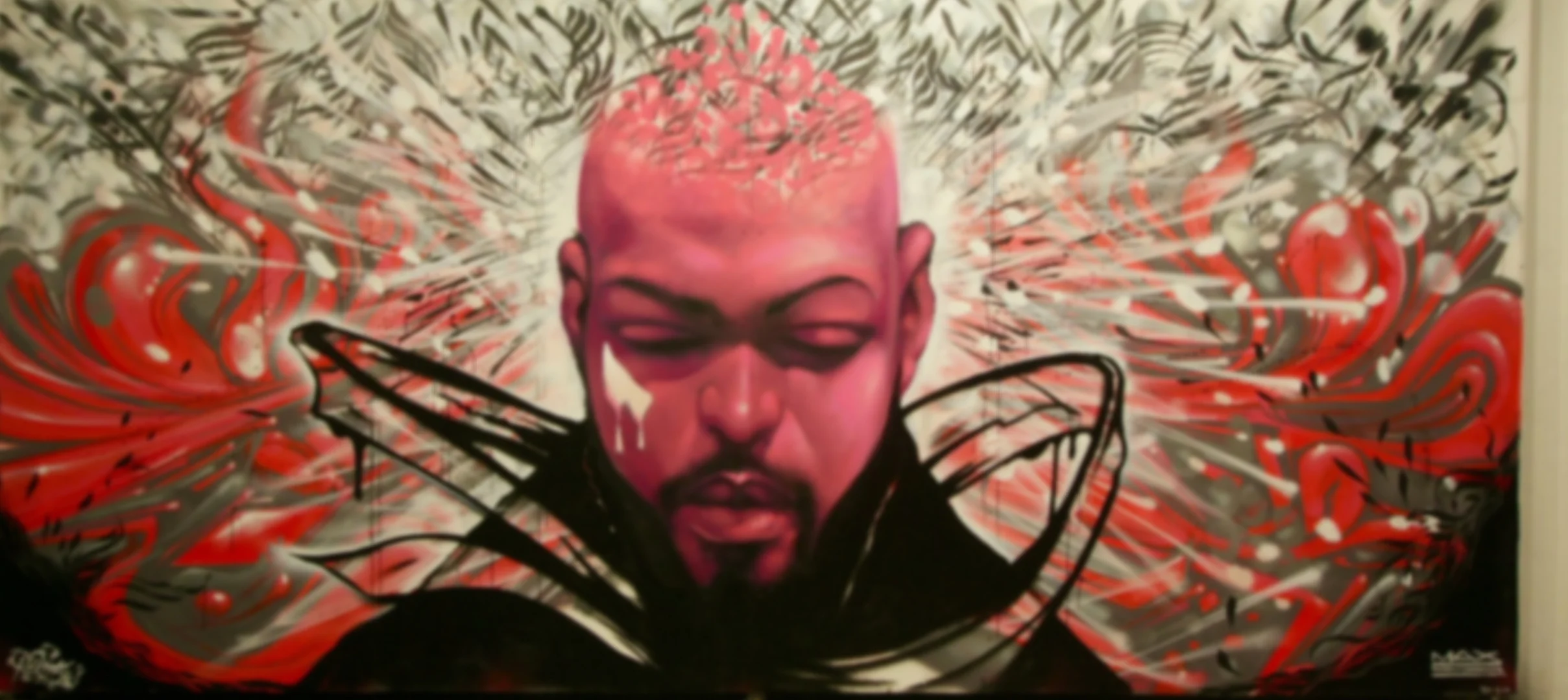 Revise’s abstract line and hand styles serve as the perfect background layer to Max Sansings well-structured characters. Background detail consisted of acrylic spray and brush work several layers deep. Once the background was laid down Max was able to effortlessly create the bust of the ethereal traveler. There was the conscious effort between the two to make sure that their work blended together seamlessly, particularly with the collar of the cloak resulting in the epitome of this type of imagery. The highlights on the cheekbones and nose are indicative of his shading, with that color often used to accomplish this in his pieces.